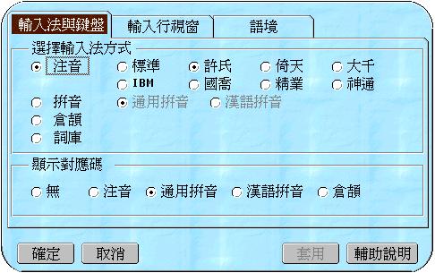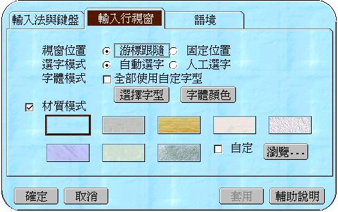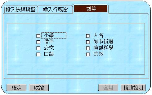 設定視窗。在此,輸入法/輸入行/語境可由使用者依據使用上的實際需求,調整相關項目。